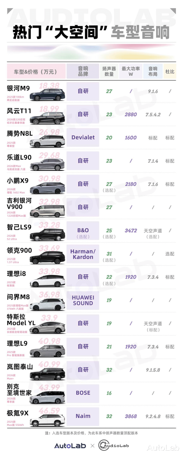 在此我们也通过2026年将会上市的热门大六座和大空间车型,预测一下座舱声学这个“新兴”的领域,从堆料到生态重构的2.0时代会是怎样的一番盛况。
