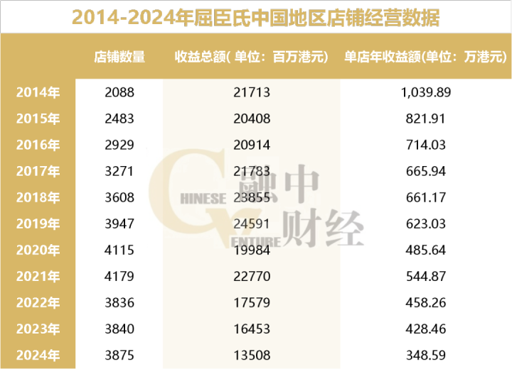 但盲目扩张导致单店效益断崖式下滑,如下图所示,2014年单店年收益为1039.89万港元,2020年腰斩至485.64万港元,2024年进一步跌至348.59万港元。