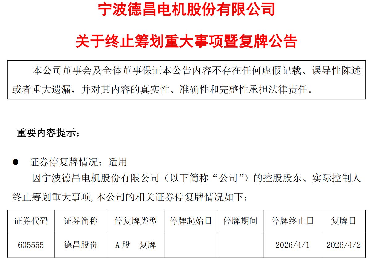 4月1日晚间,德昌股份(SH605555)公告称,终止筹划公司股份部分转让的重大事项,公司股票将于4月2日复牌。对于终止原因,公司表示,主要因控股股东、实际控制人与交易对方“由于涉及事项较多,双方就其中某些核心条款未能达成一致意见”。